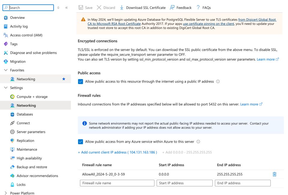 - Check the box next to Allow public access to this resource through the internet using a public IP address and Allow public access from any Azure service within Azure to this server. Also, click on the link + Add 0.0.0.0 - 255.255.255.255 to open access to the database from any IP address, but ensure it meets your security requirements and that you are using a strong, complex password for database access.